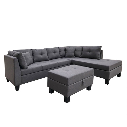 Sectional Sofa Set for Living Room with Right Hand Chaise Lounge and Storage Ottoman (Dark Grey)