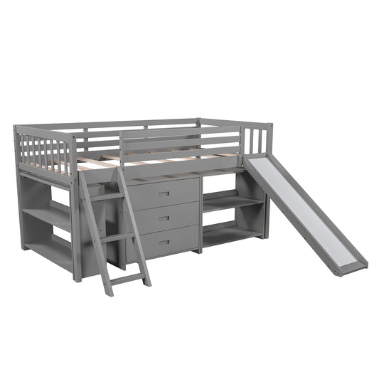 Solid Wood Low Loft Bed with Attached Bookcases and Separate 3-tier Drawers,Convertible Ladder and Slide,Twin,Gray(Expected arrival time 9.15)