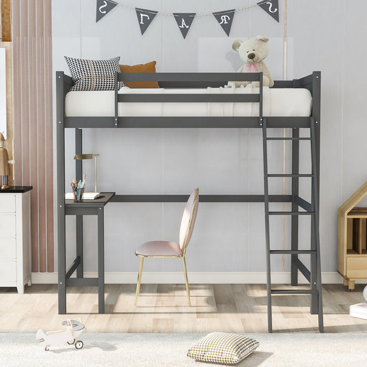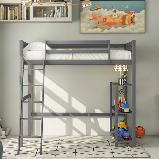 Twin size Loft Bed with Storage Shelves and Ladder-Gray