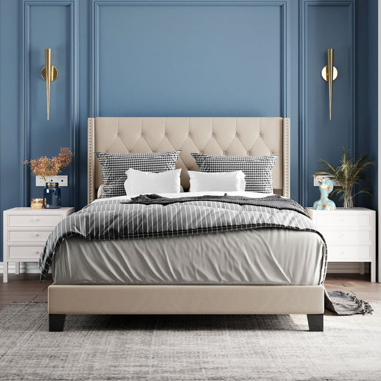 Upholstered Platform Bed with Classic Headboard, Box Spring Needed, Beige Linen Fabric, Queen Size