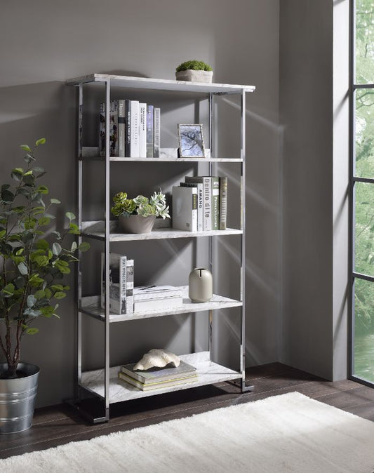 Visage Bookcase, White Printed Faux Marble & Chrome 92937