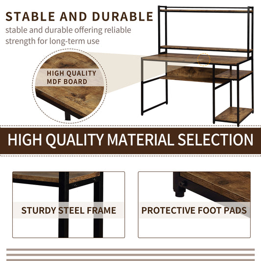 Home Office Computer Desk with 2-Tier Bookshelf and Open Storage Shelf/Equipped with Removable Monitor Riser(Brown)