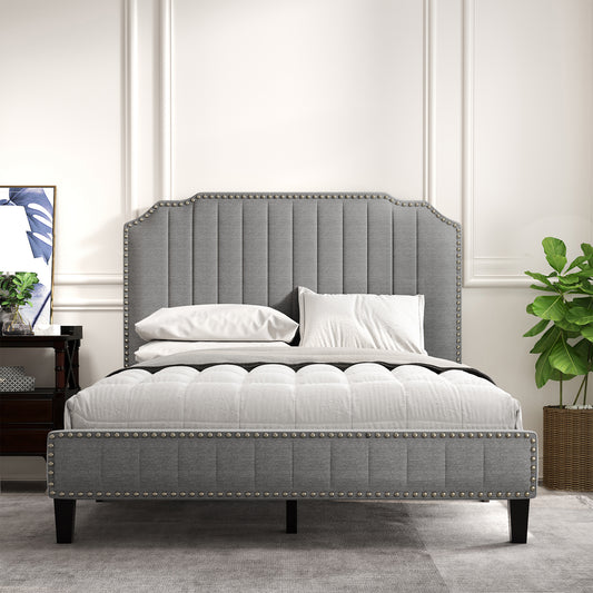 Modern Linen Curved Upholstered Platform Bed , Solid Wood Frame , Nailhead Trim (Full)