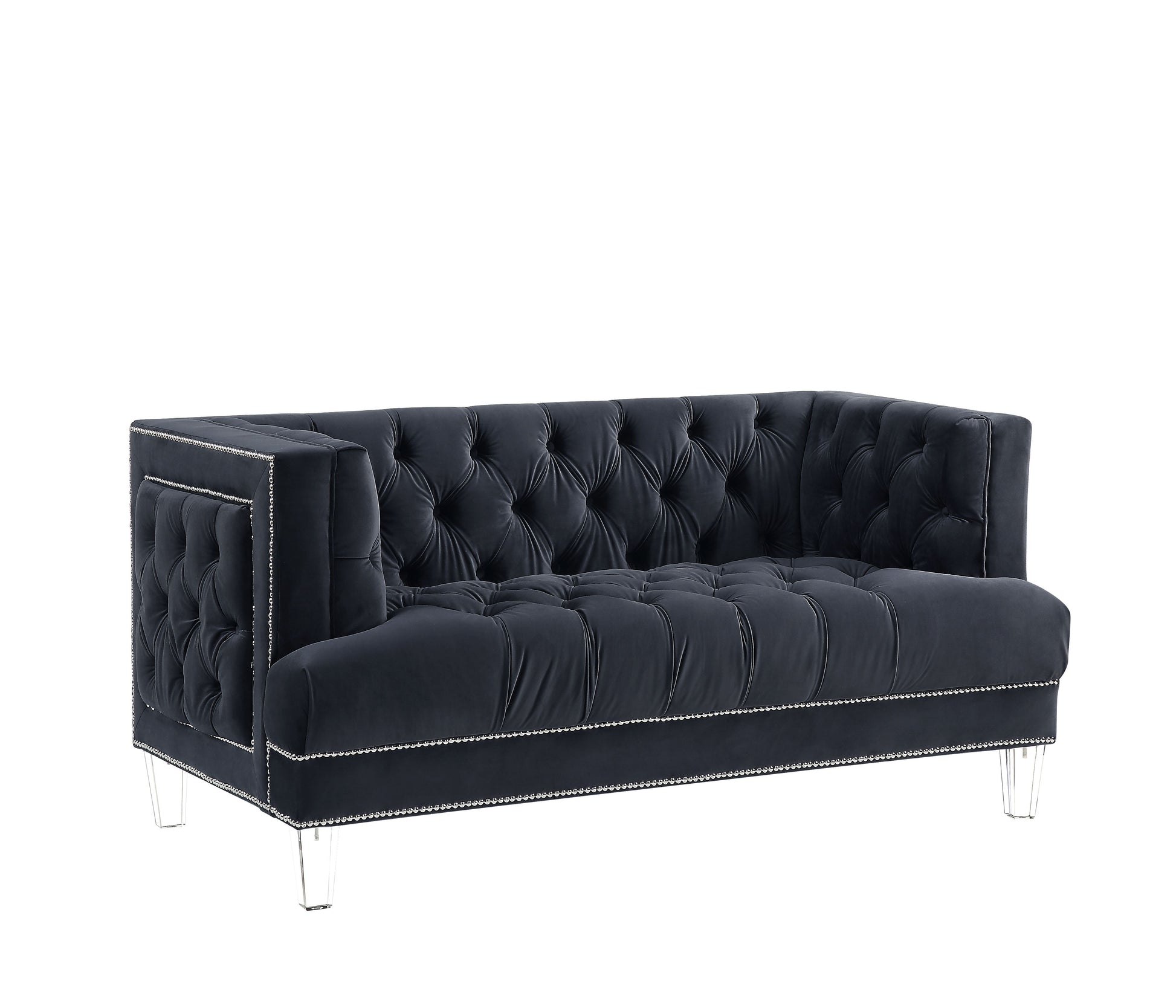 Romance : Sophistication meets modern with the Ansario living room collection. The rich blue velvet adds character to any room. Showcasing a square back, high arms, and nail-head trim, feature button tufted accents. The acrylic legs give off a modern vibe to the pieces. The full foam seats ensure that your next TV binge will be done in complete comfort.