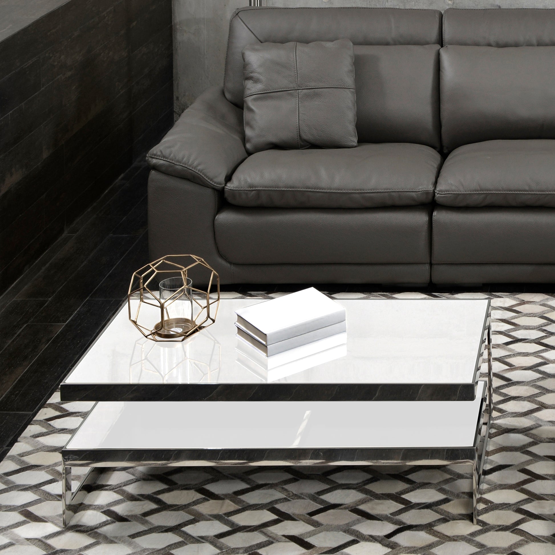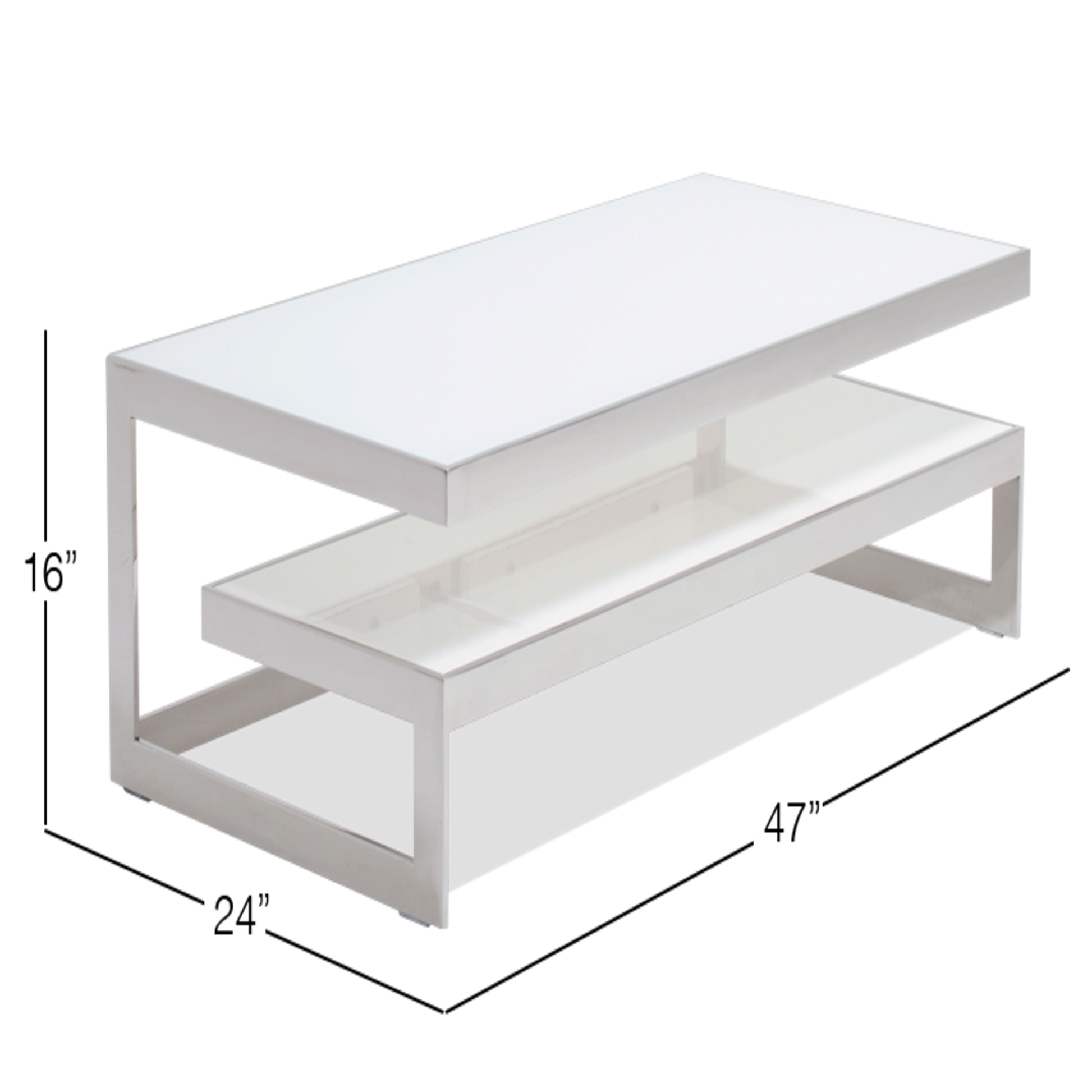 Luxury and sophistication are the perfect trais of the Salotti Collection; crisp, clean lines and structural style: the clearest statement of the Italian Design. This piece is handcrafted with an angular solid stainless steel base. For a perfect cosmopolitan look with a white tempered glass top creating a sleek touch, making this coffee table the perfect accent for your living room or den; allowing you to complete it with accesories, a vase or a sculpture. This coffee table is backed up with one year commercial warranty. Please note assembly is required. Product details: top material is tempered glass and base material is stainless steel.