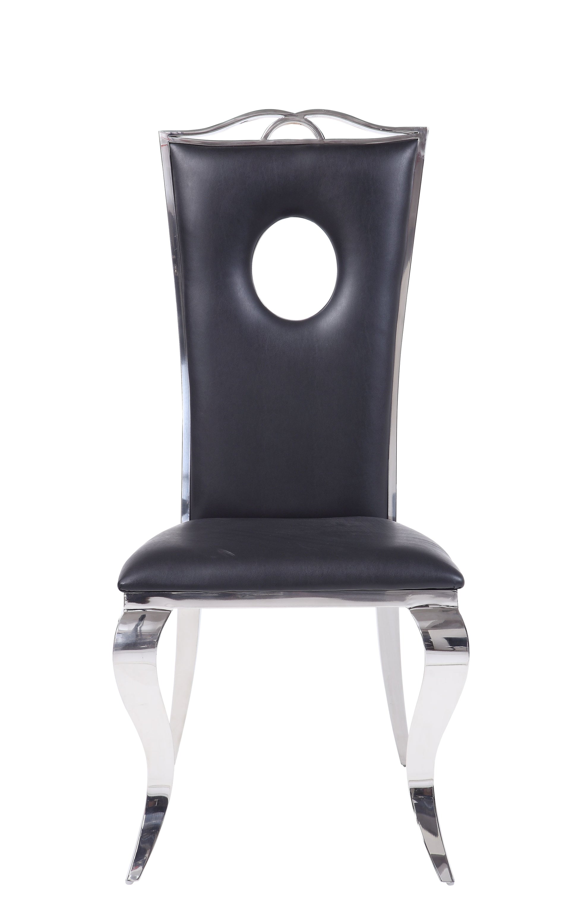 Product Details : Armless Chair (High Backrest) : Stationary Seat: Standard Dining Height : Padded SEAT & BACK: PU Cushion (Cut-out Back: Circle Shape) : Metal Backrest Trim & Apron Seat: Stainless Steel : Metal Cabriole Front Leg: Stainless Steel, Metal Thick: 1.2mm