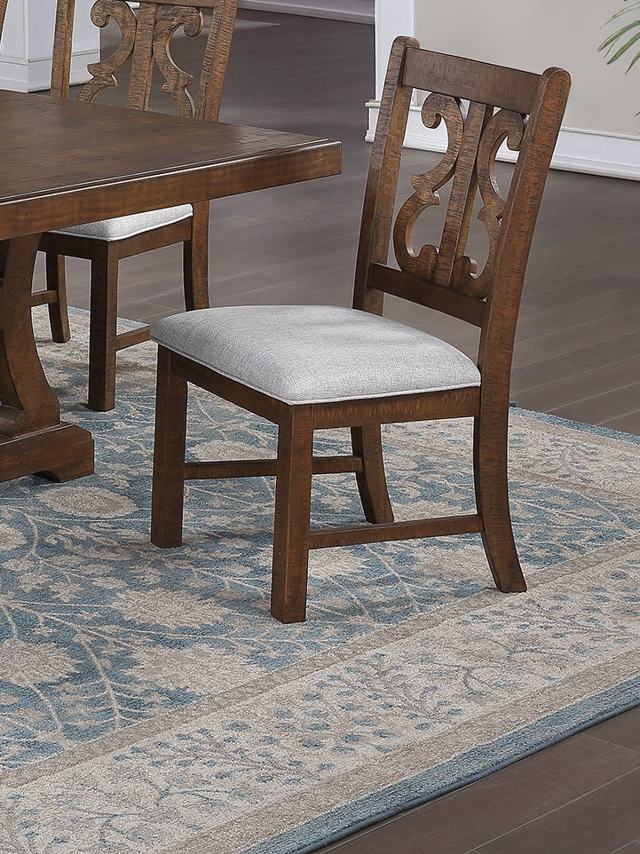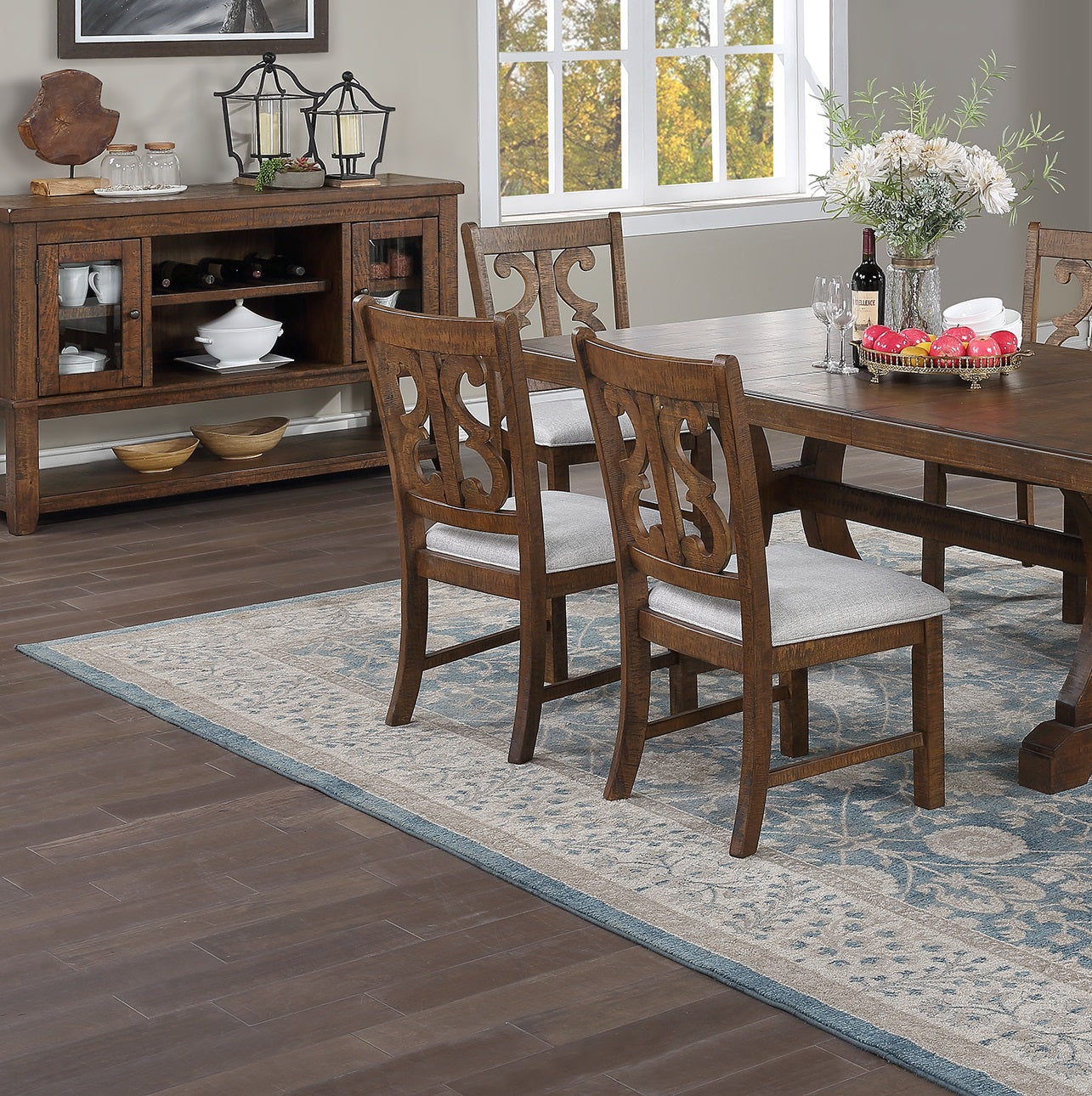 A formal dining set with distressed painted style that comes Set of chairs. This beautifully crafted wooden set, elevates your dining room decor with its modern yet classy design. The distress painted chairs upholstered with cushions, and it provides more comfort during a family gathering. The dining room server with multiple storage space, is built with luxury and function in mind, able to hold up silverware and even a lamp on the top shelf for your storage convenience. If you are planning to set up a classy space to host your friends and families, look no further.