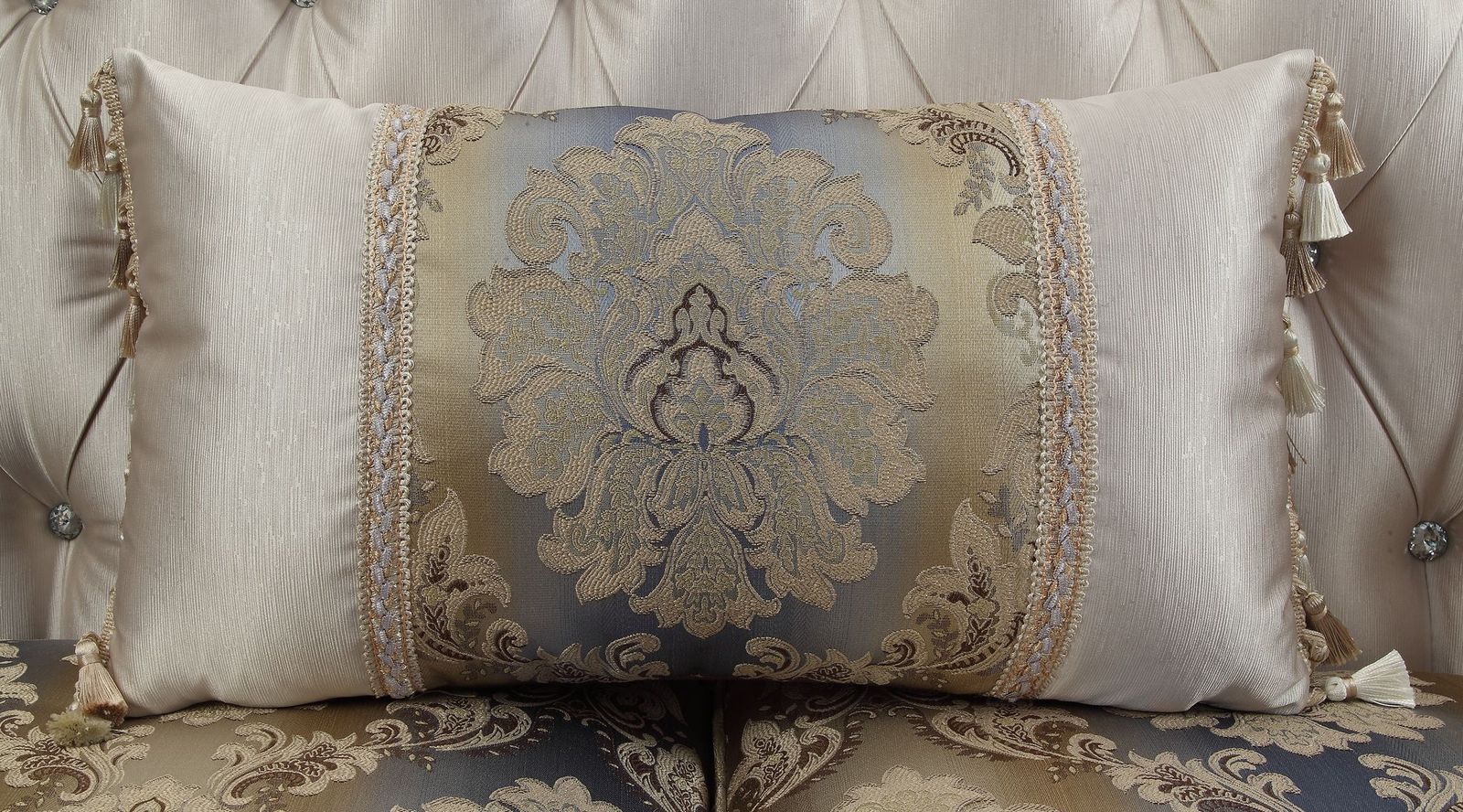 Product Details : Assembled, w/1 Pillow : Tight Back & Loose Seat Cushion (1+2) : Features: Crystal like Button Tufted, Nailhead Trim, Oversized Floral Molding Trim :: CONSTRUCTION :: SEAT: Pocket Coil, Inside Frame: Wood, Box Cushion w/Welt (NOT Reversible) : BACKREST: Arched Shape, Crystal like Button Tufted : ARMREST: Rolled Style : Scrolled Molding Trim: Backrest, Top/Front Arms, Base, Leg (Poly-Resin) : Wood/Poly-Resin Queen Anne LEG ::: Material: Polyester Fabric (Solid Pattern) : Pillow: Assorted Shapes (Contrast Patterns, Removable Cover)