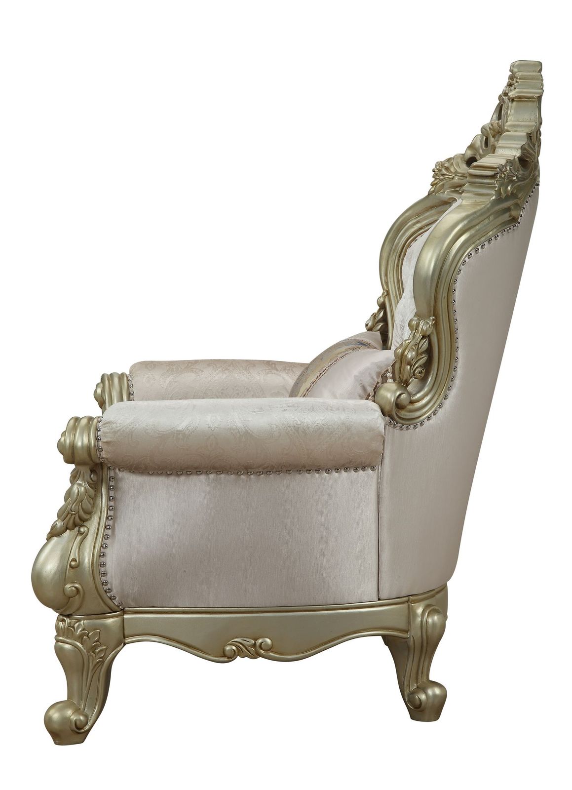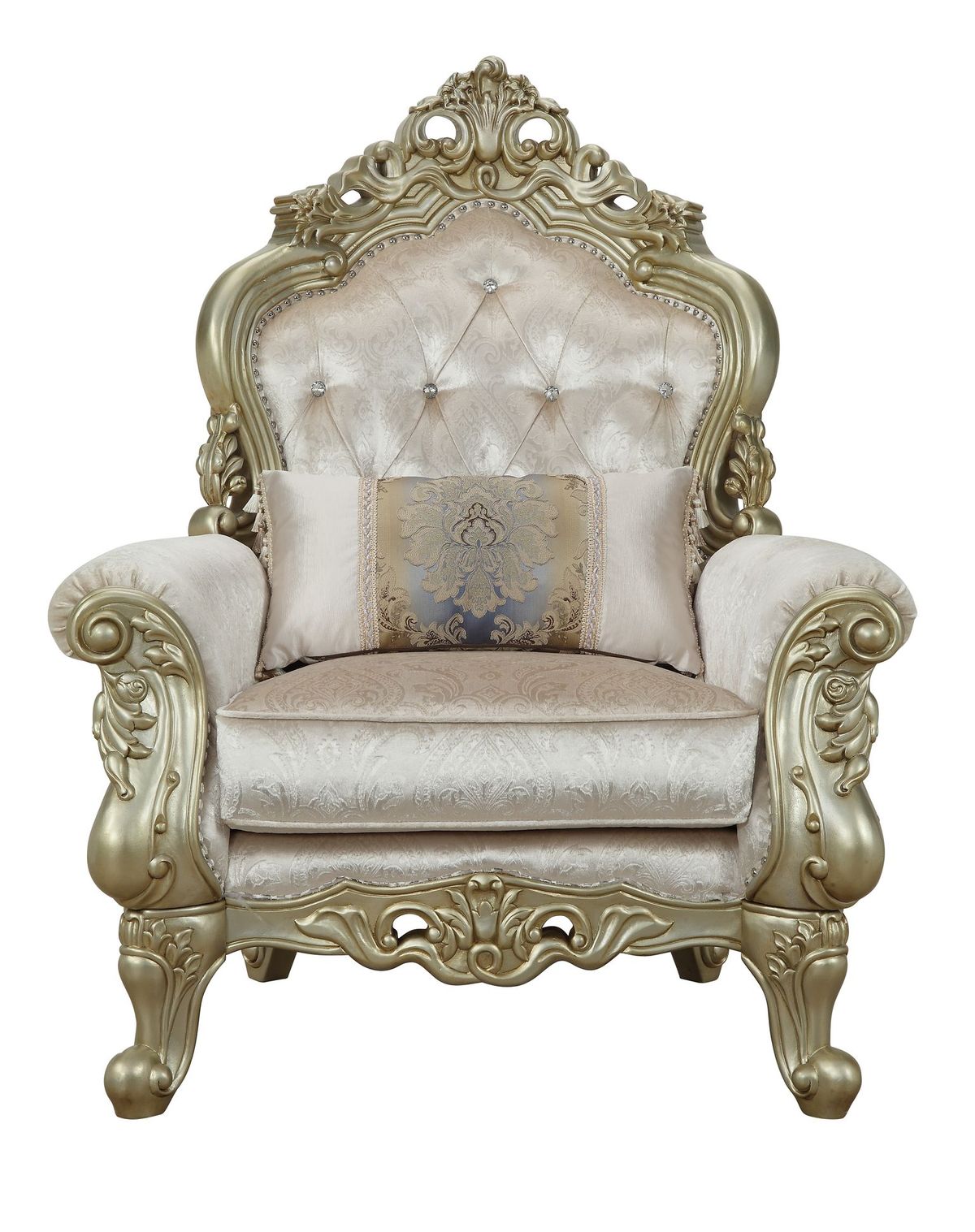 Romance : Exclusively designed and filled with romantic spirit, this beautiful chair features Queen Anne legs and carved aprons and trim, decorated with raised and scrolled floral motifs in an antique champagne finish. Each piece of this sophisticated living room set boasts of curved and rolled arms, oversized molding and crystal-like button tufted backrests with nailhead trim. This three piece collection with contrasting accent pillows will bring sophistication to your living room and will add elegance to any room Decor.