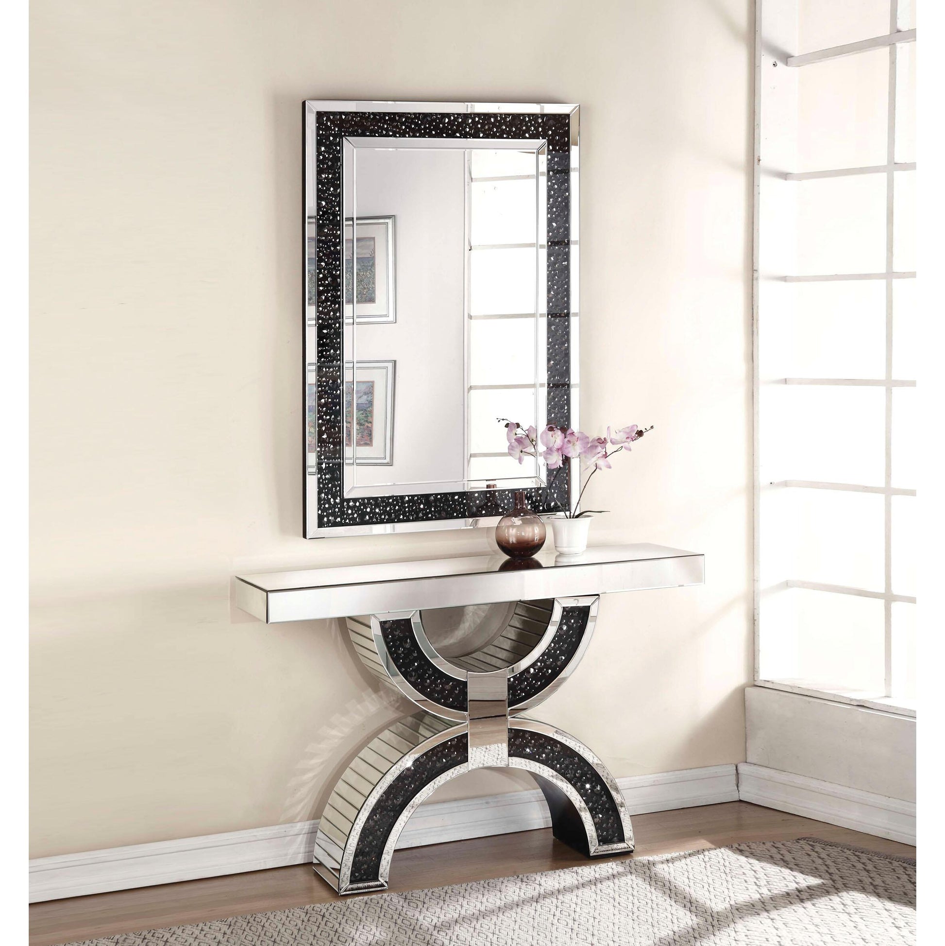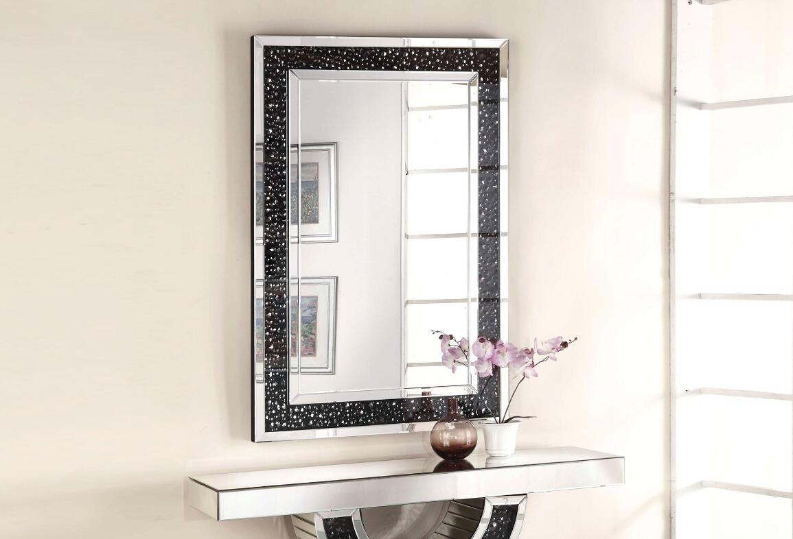 Romance : The Noor mirrored wall accent mirror is sure to be the focal point of any room. Dramatically cast with a contrasting black framed background with black crystals. Faceted optic glass crystals adorn the skill layering it with added luxe and brilliance. To complete the look, a beveled mirrored border frames the piece creating an intricate play of light and refection.
