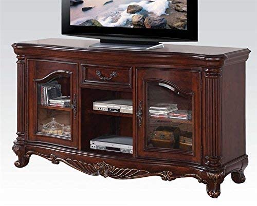 Romance : The Remington TV stand classic style will blend masterfully in your living room area. The storage feature offers plenty of space to keep your entertainment components: two glass doors, two media compartments, and one top drawer. Carefully constructed from selected wood and veneers in rich Cherry Finish. Highly decorative details, scrolled feet and decorative scrolled moldings give this piece an elegant and sleek appeal.