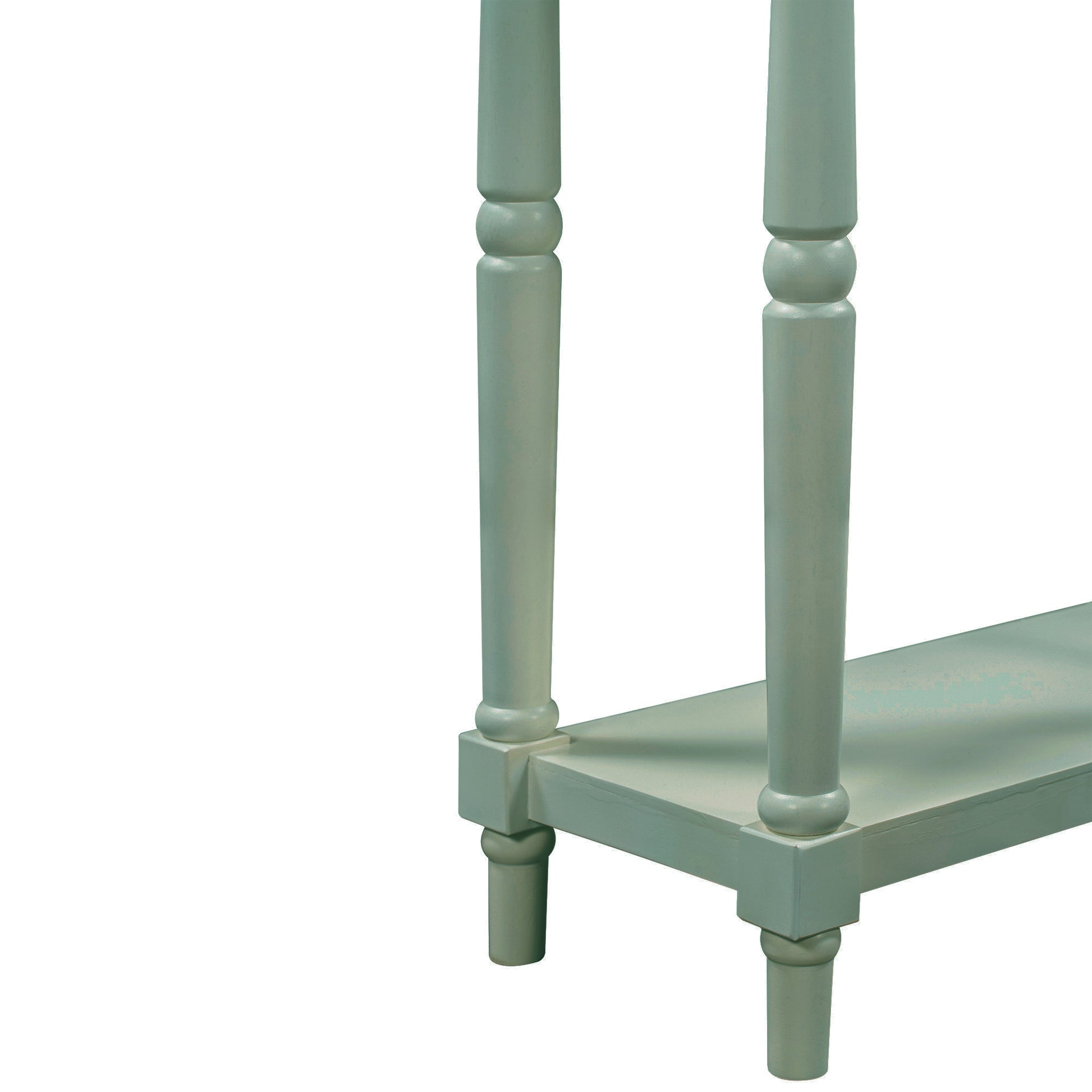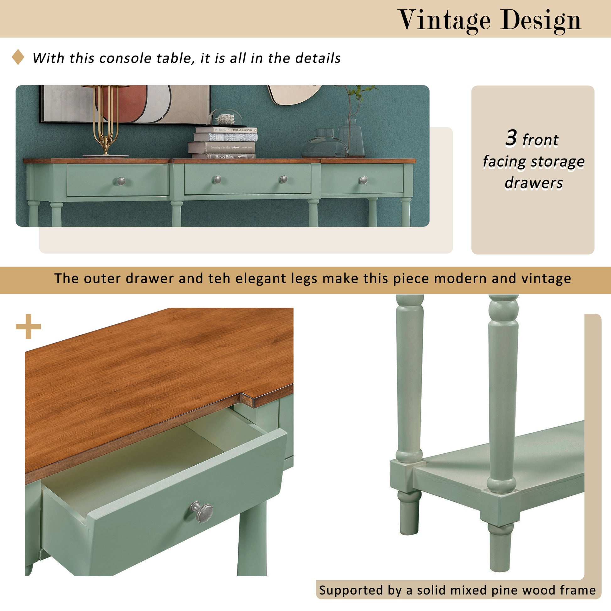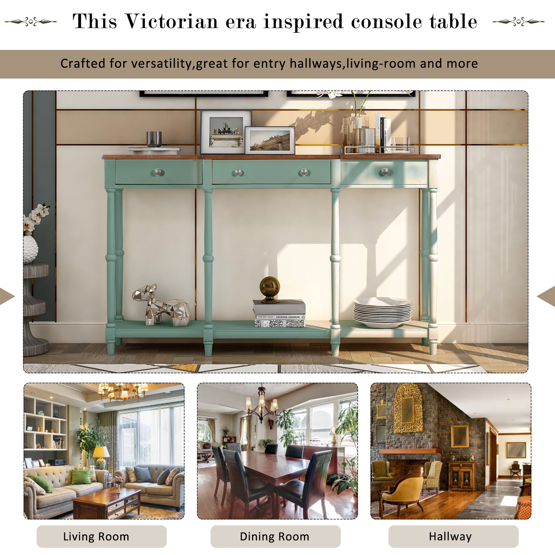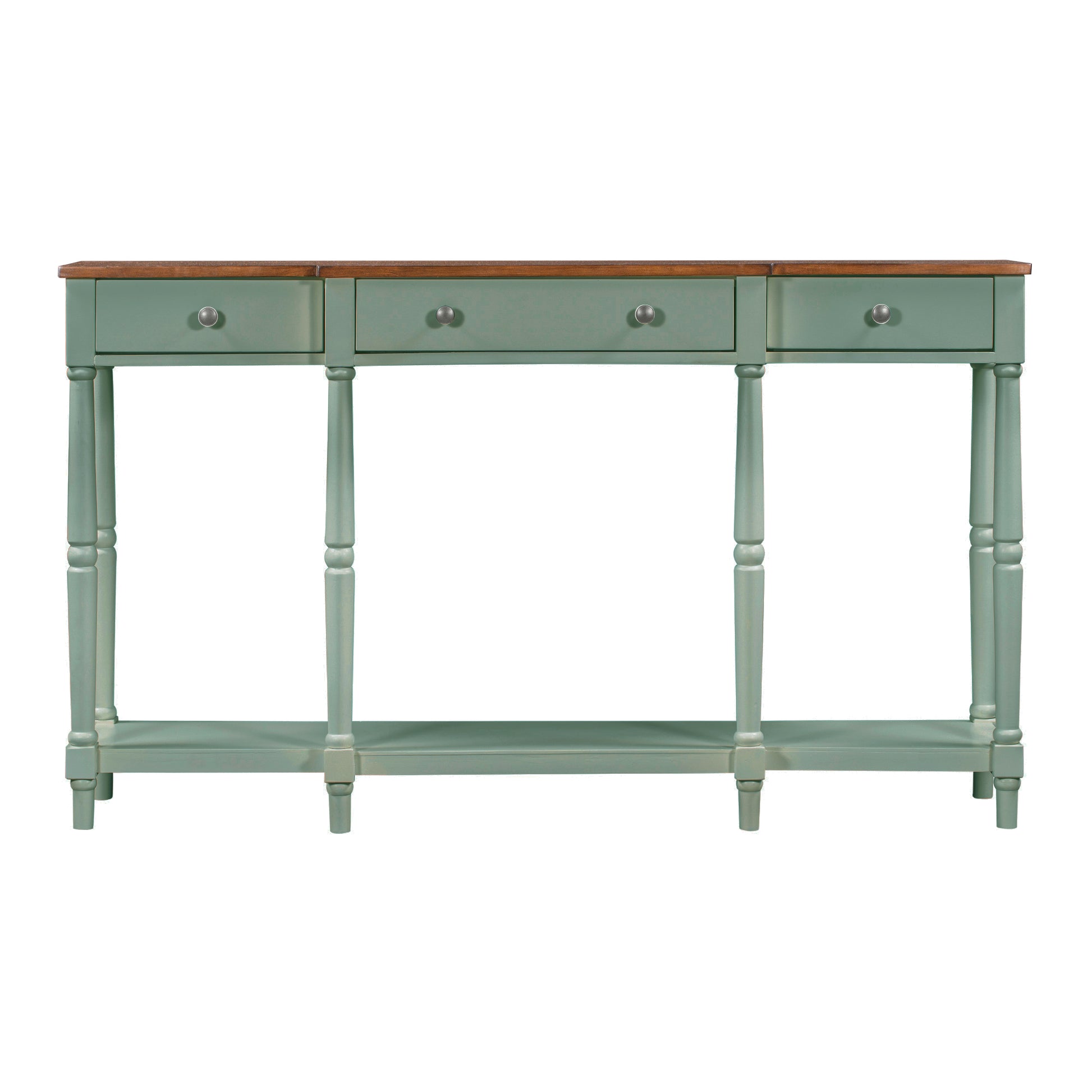 Give an empty space in your home a much needed pick me up with this Victorian era inspired console table. Crafted with a design that exudes elegance, this table features wood accent detailing throughout the strengthened mixed Pinewood frame for a chic overall aesthetic. With plenty of space to offer, utilize the three front facing storage drawers to minimize clutter while keeping select essentials within easy reach, or display your favorite décor on the spacious upper counter or bottom shelf. Sealed in an Ivory, Natural Wood or Antique Blue wear and chip resistant lacquer, this console table will be a staple in your home for years to come.