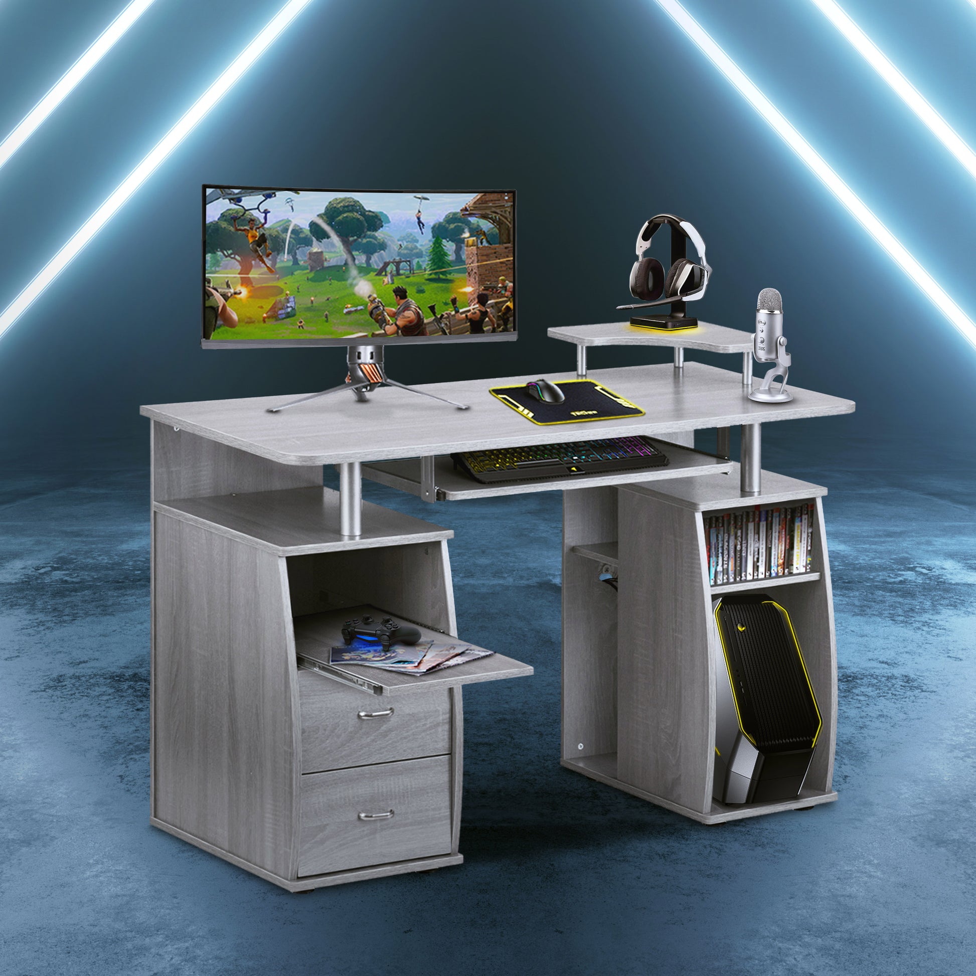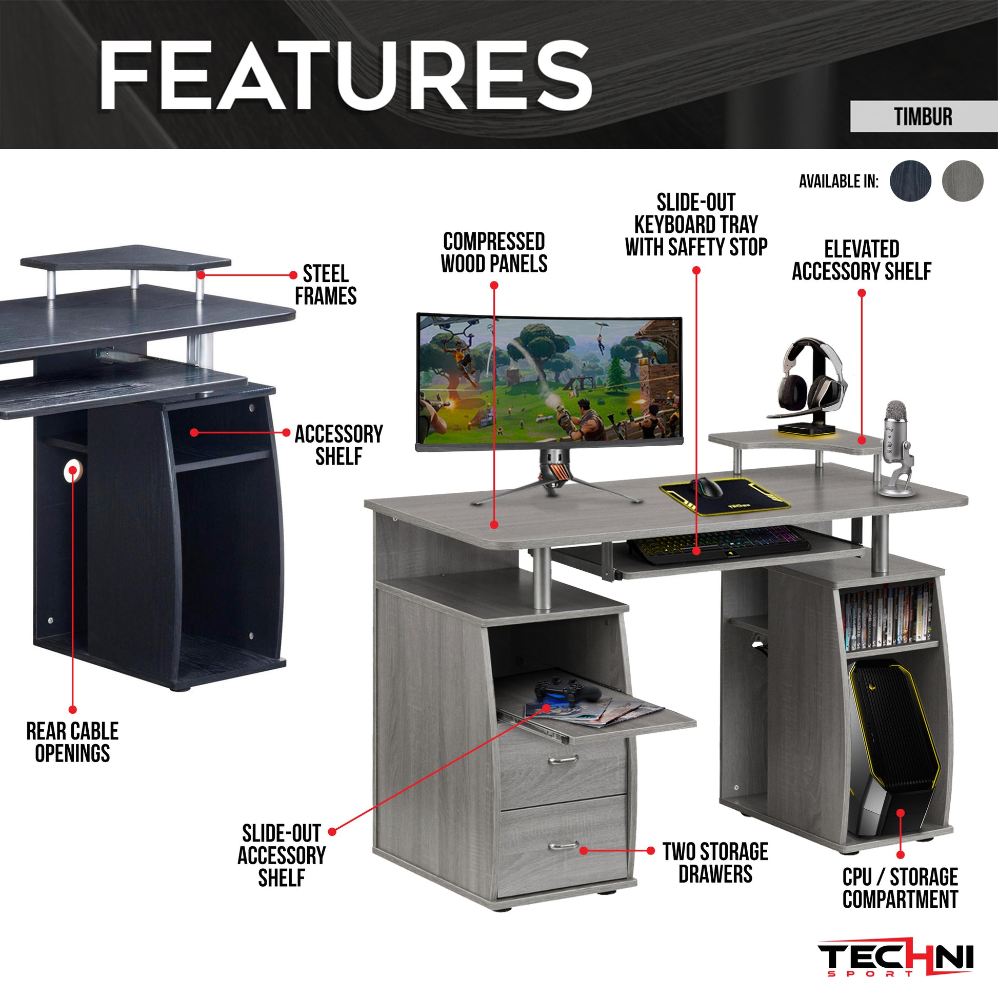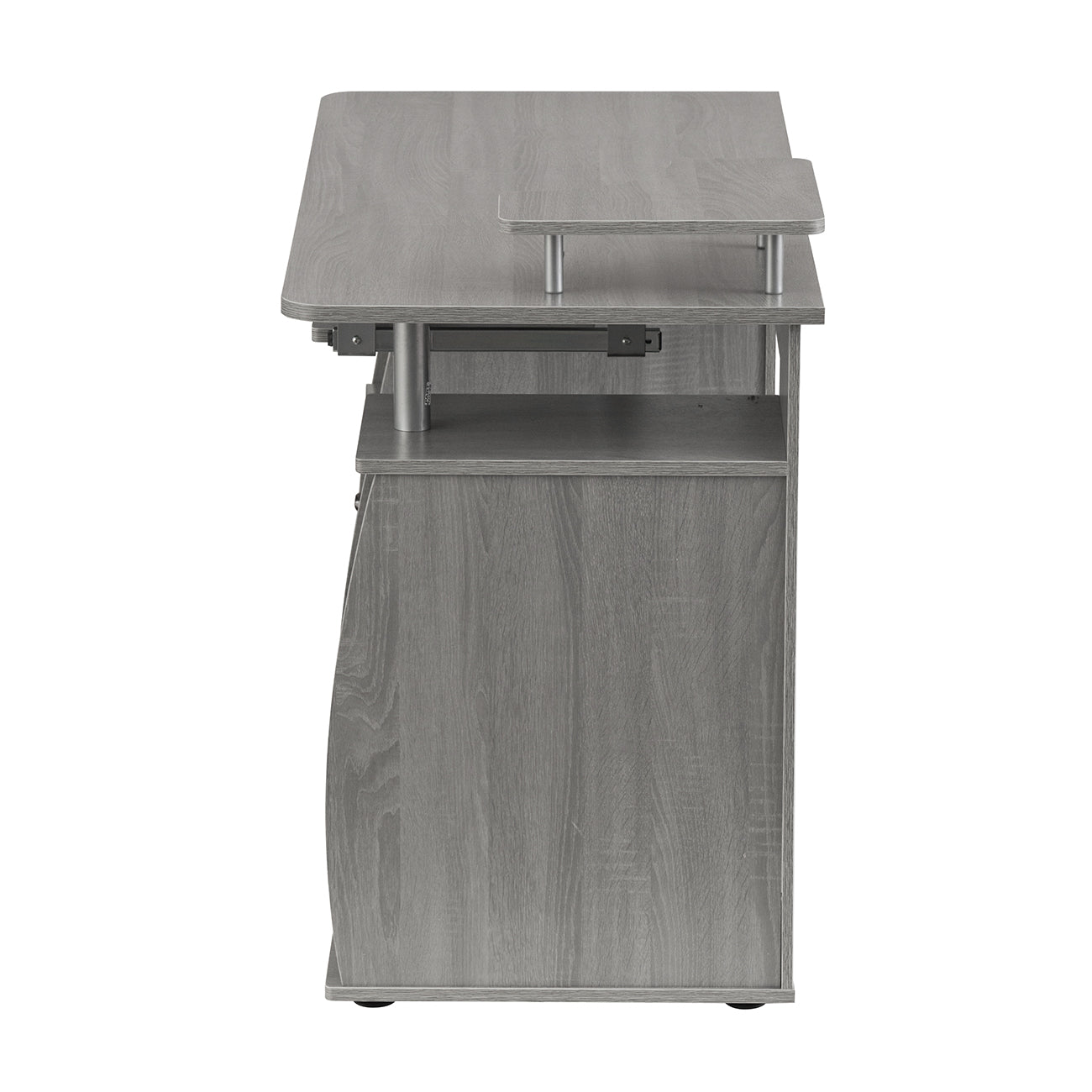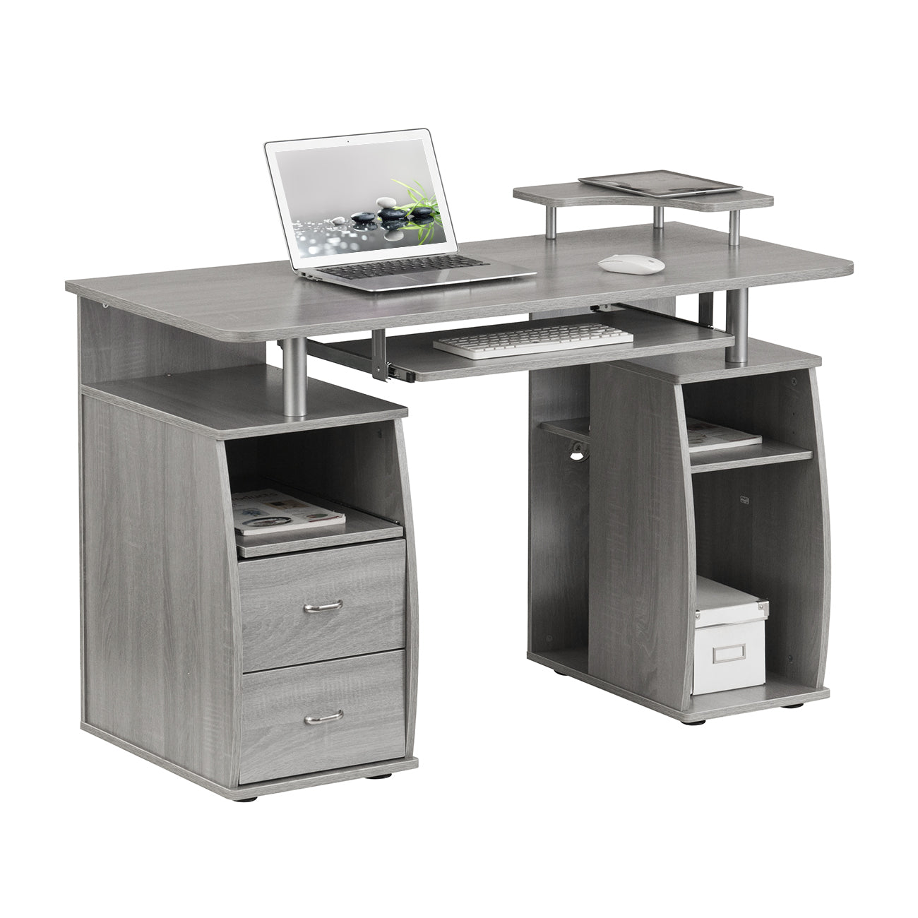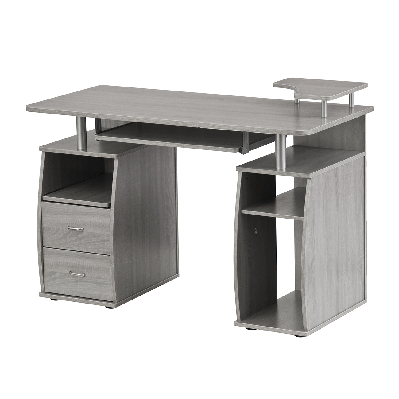 LONG DESCRIPTION : The Techni Mobili Dual Complete Computer Workstation Desk includes an elevated accessory shelf, slide-out keyboard and accessory shelves—both equipped with safety stops, 2 storage drawers, and an open CPU compartment with a shelf that can be moved up, down or completely removed. The elevated desktop provides additional storage above the pedestals. The slide-out accessory shelf and CPU compartment each have rear cable openings. The desktop has an 80 lbs. weight capacity, while the shelves can each hold up to 30 lbs., and the drawers each have a 22 lbs. weight capacity. This amazing multifunctional desk is made with MDF panels in grey color, with a moisture laminate veneer. It's stylish frames are made of scratch-resistant powder-coated steel, adding elegance to it's fine design. Color: Grey