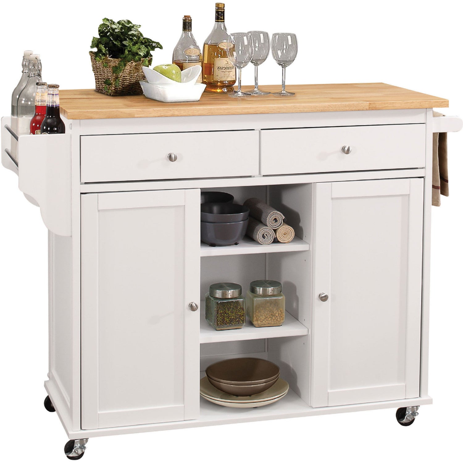 Romance : Add storage space and charm to your kitchen with this Tullarick wheeled kitchen island. The stylish white finish and natural wood top along with silver handles and pulls make this cart an adorable addition to cottage, contemporary or beach decor schemes. This modern kitchen island cart features ample storage for all your cooking needs with shelves, drawers, a condiment rack and towel rack. Some Assembly Required.