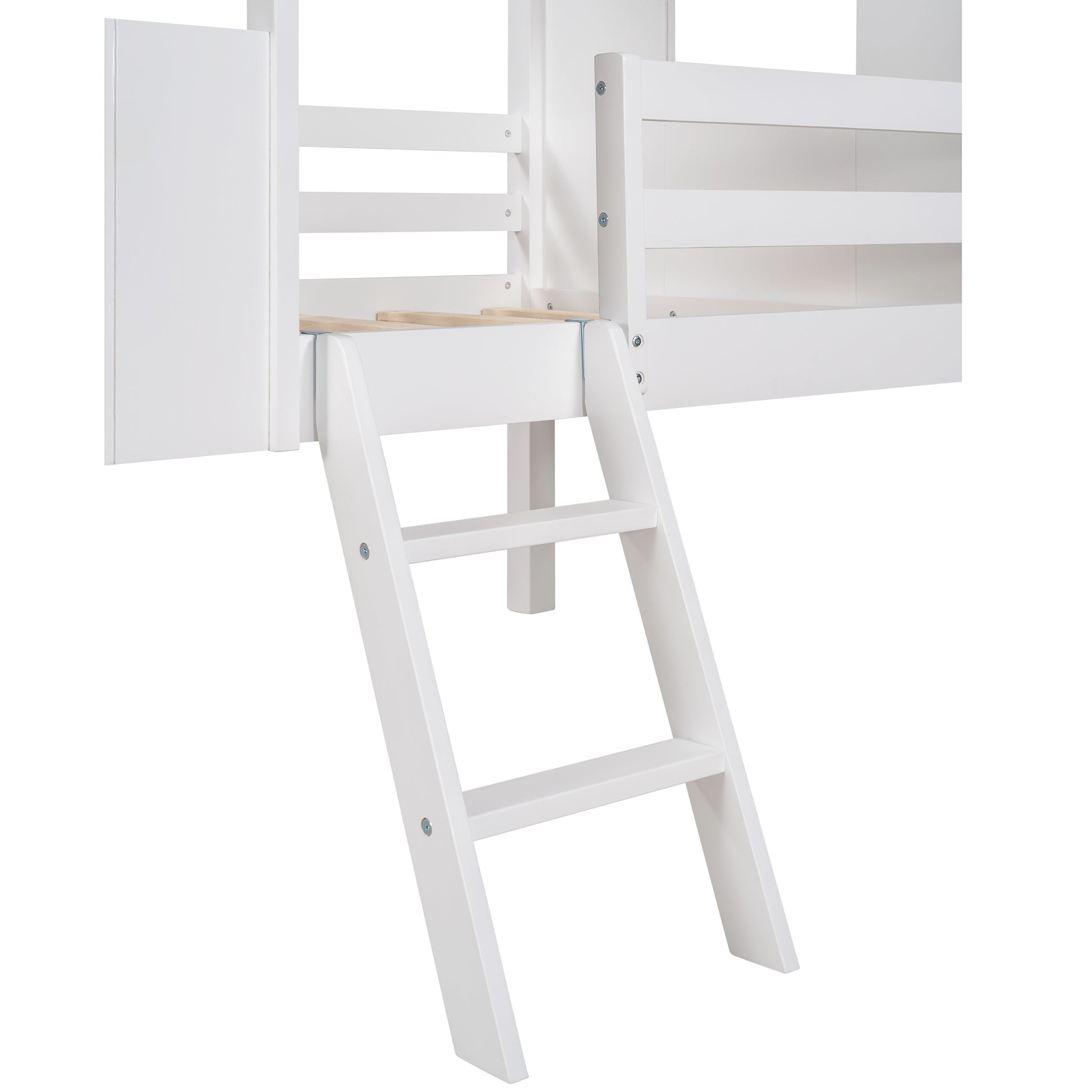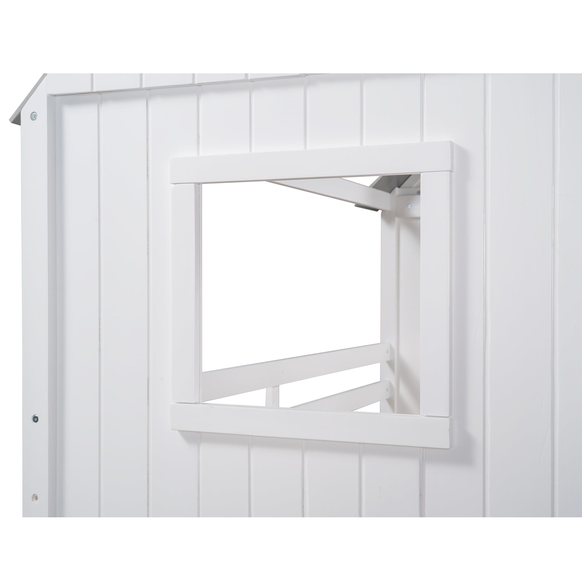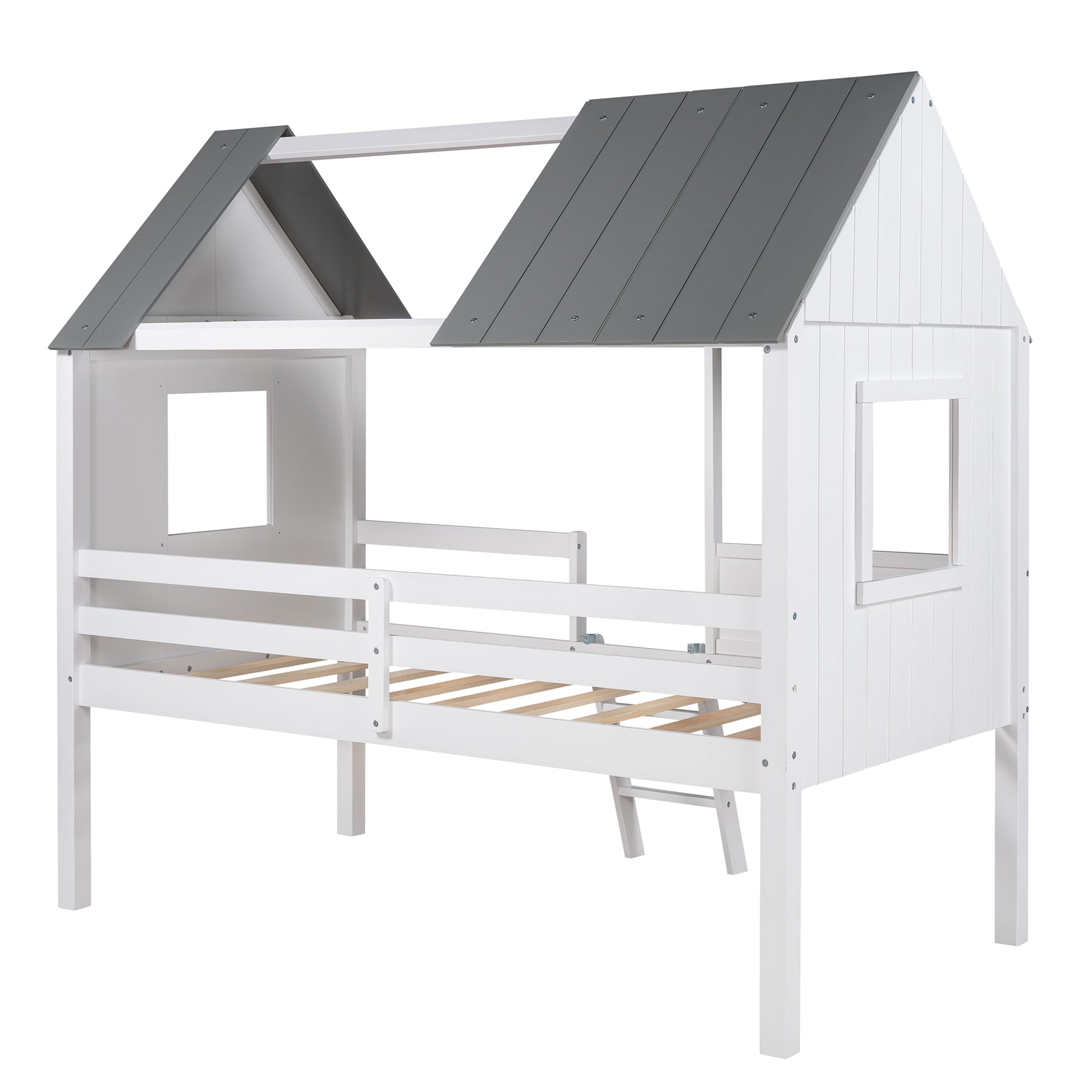 Twin Size Low Loft Wood House Bed with Two Side Windows, for Kids, Teens, Girls, Boys, (Normal Gray+Normal White)