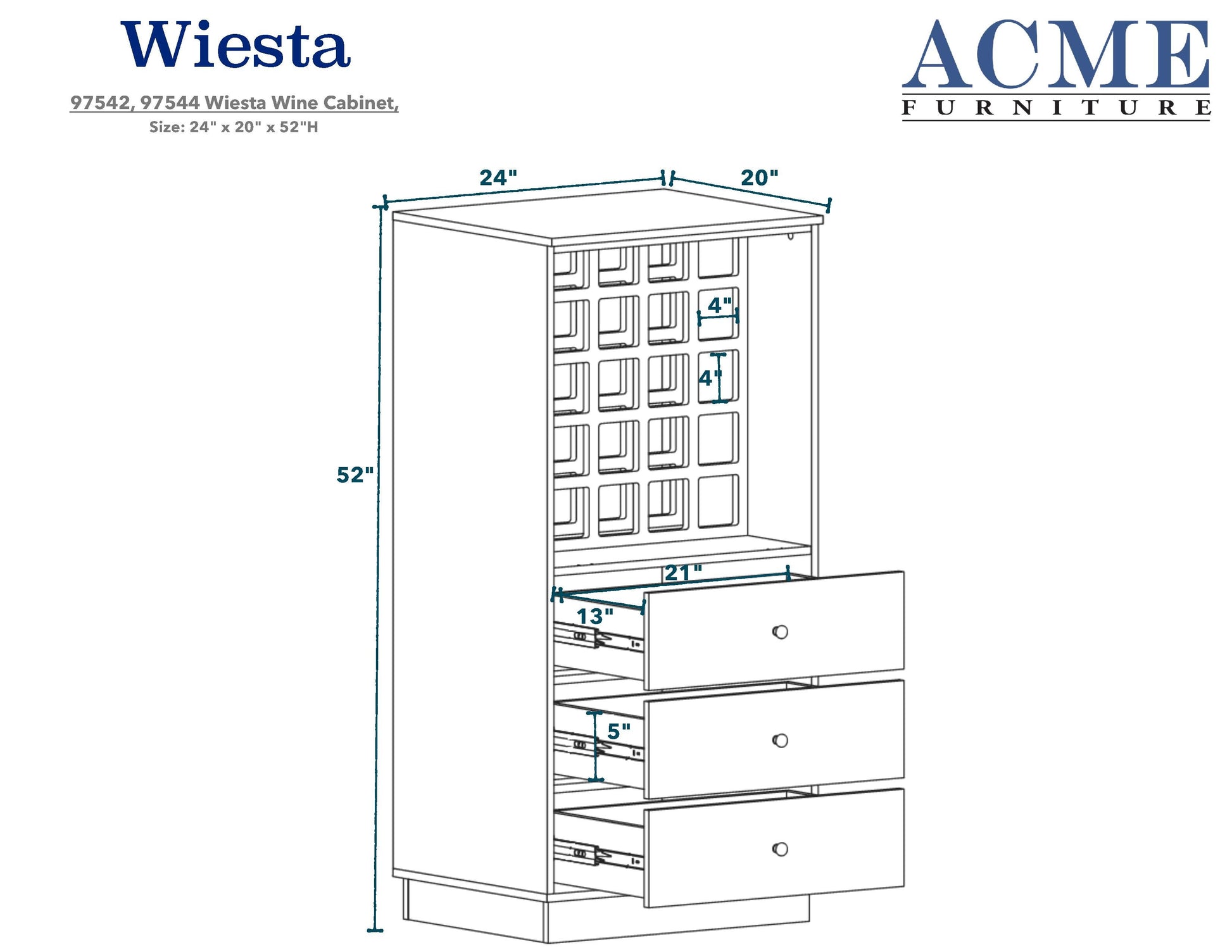 Romance : Simple yet versatile, the Wiesta wine cabinet will ensure your home is always well-stocked with your favorite wines. This collection offers two different designs, one with wine storage and three bottom drawers and the other with a wood pull-door on the top, a middle drawer, and wood bottom doors. Available in antique white and walnut finishes.