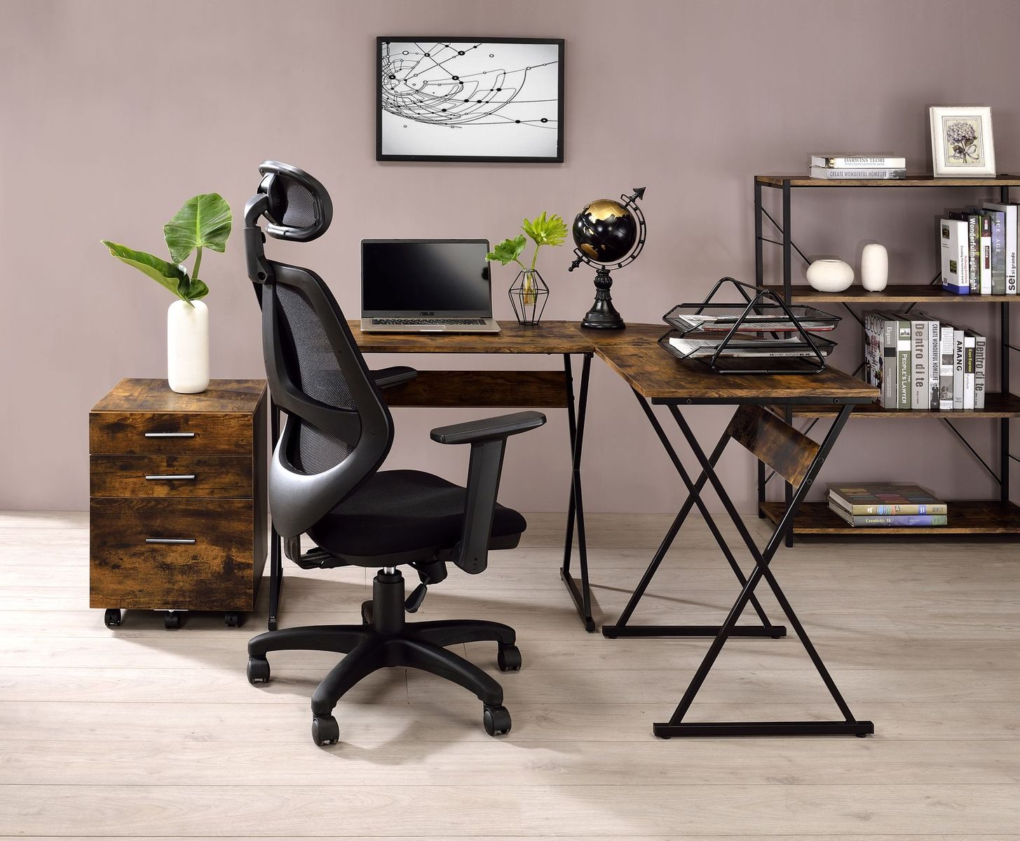 Romance : Strike a balance between contemporary design and age-old materials. The Zafiri Desk features an modern L-shaped top , with round corner design for both safety and style. The classic combination of rustic wood and black metal infuse the desk with an old-world charm. What's more, the distinctive X-shaped metal base makes the product filled with character. With large work surface and unique design style, the collection desk is truly one you will have for a long time.